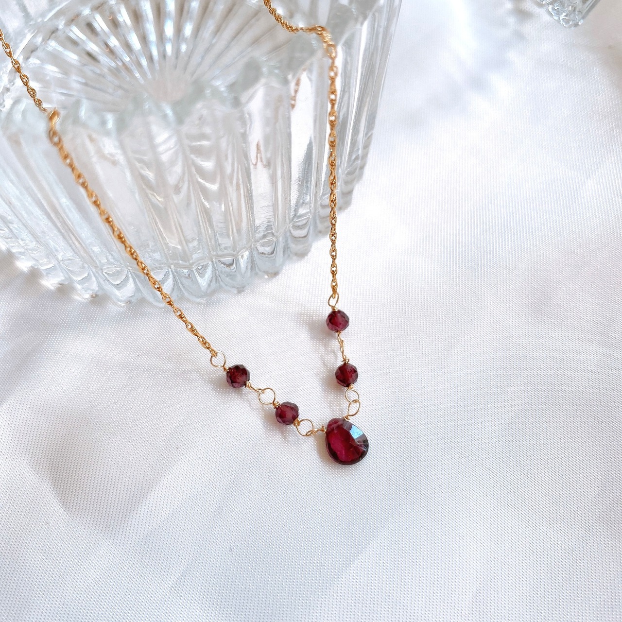 ワインレッドのガーネットが首元を美しく彩り、女性らしい雰囲気にしてくれます。