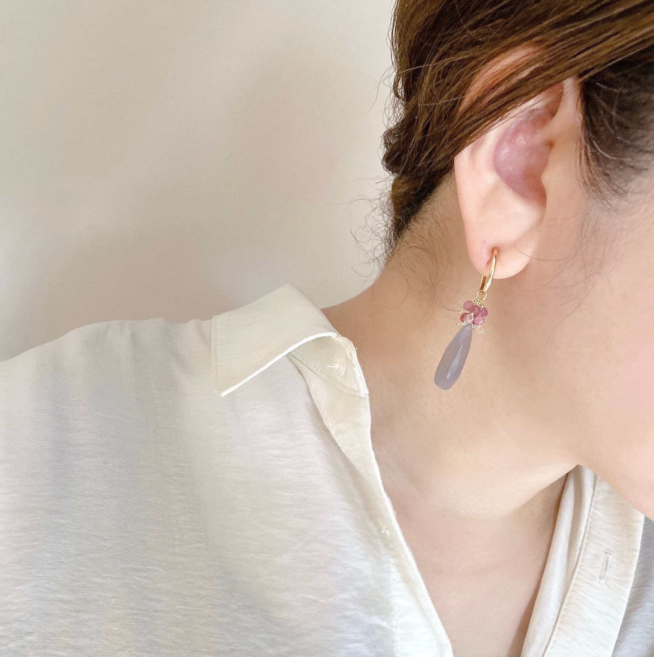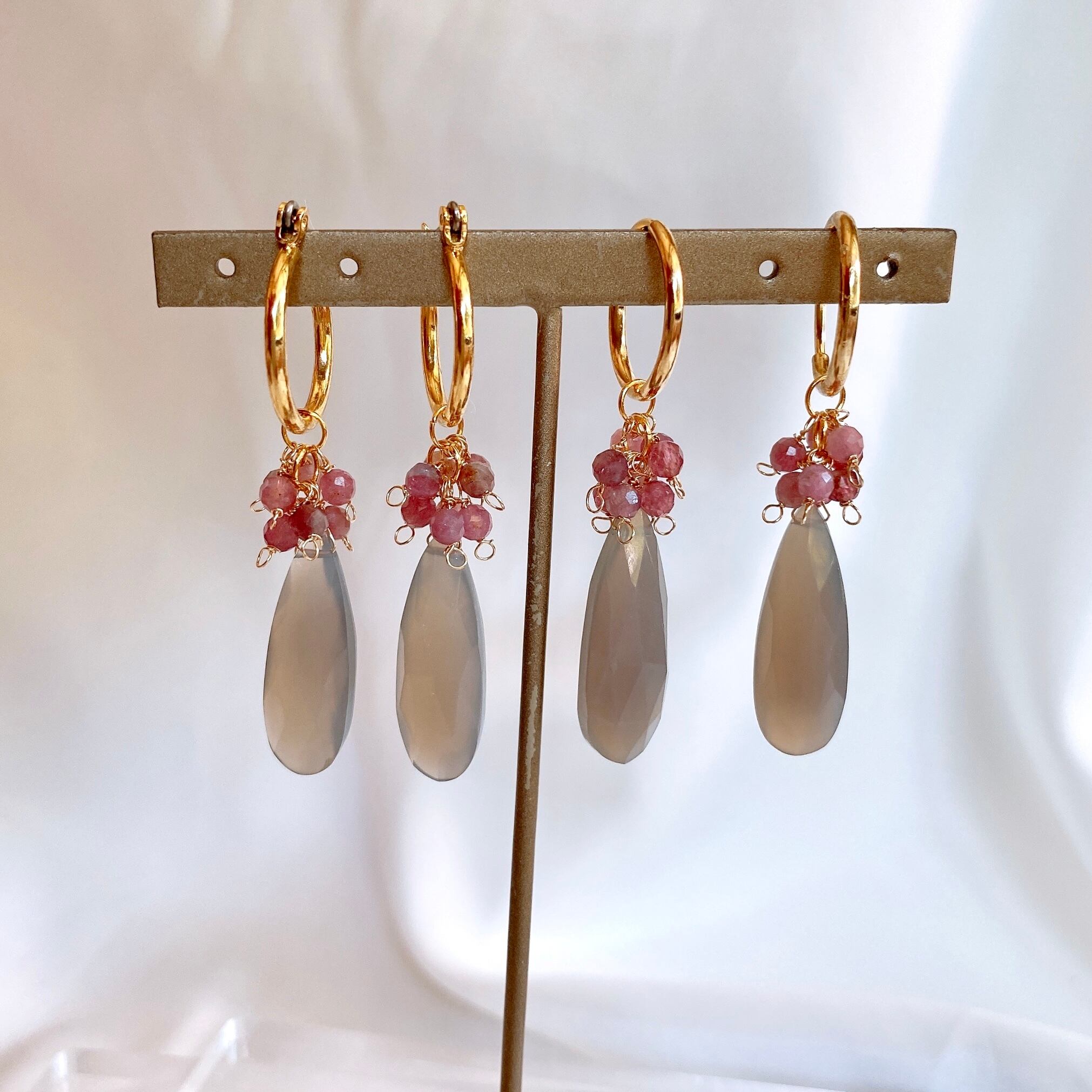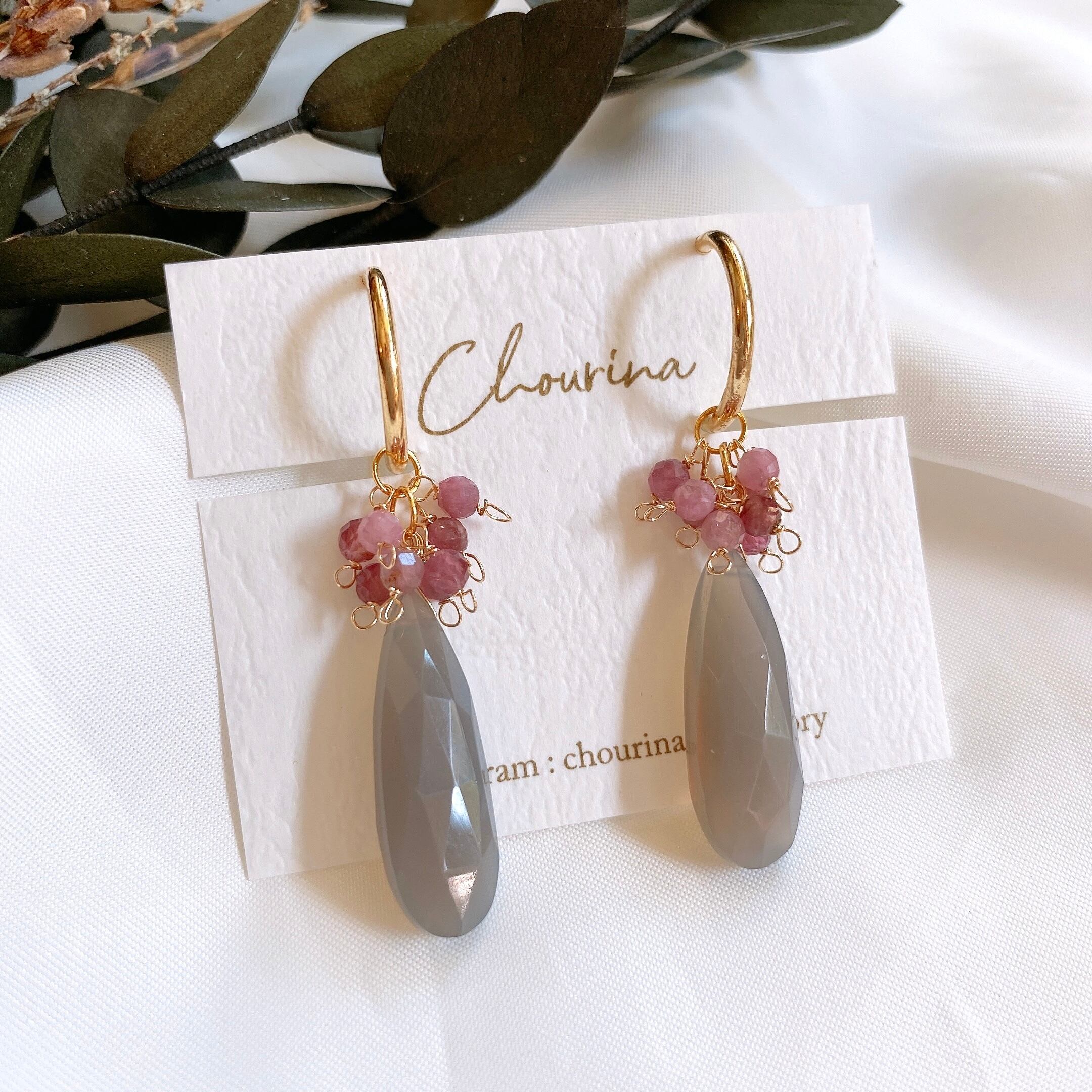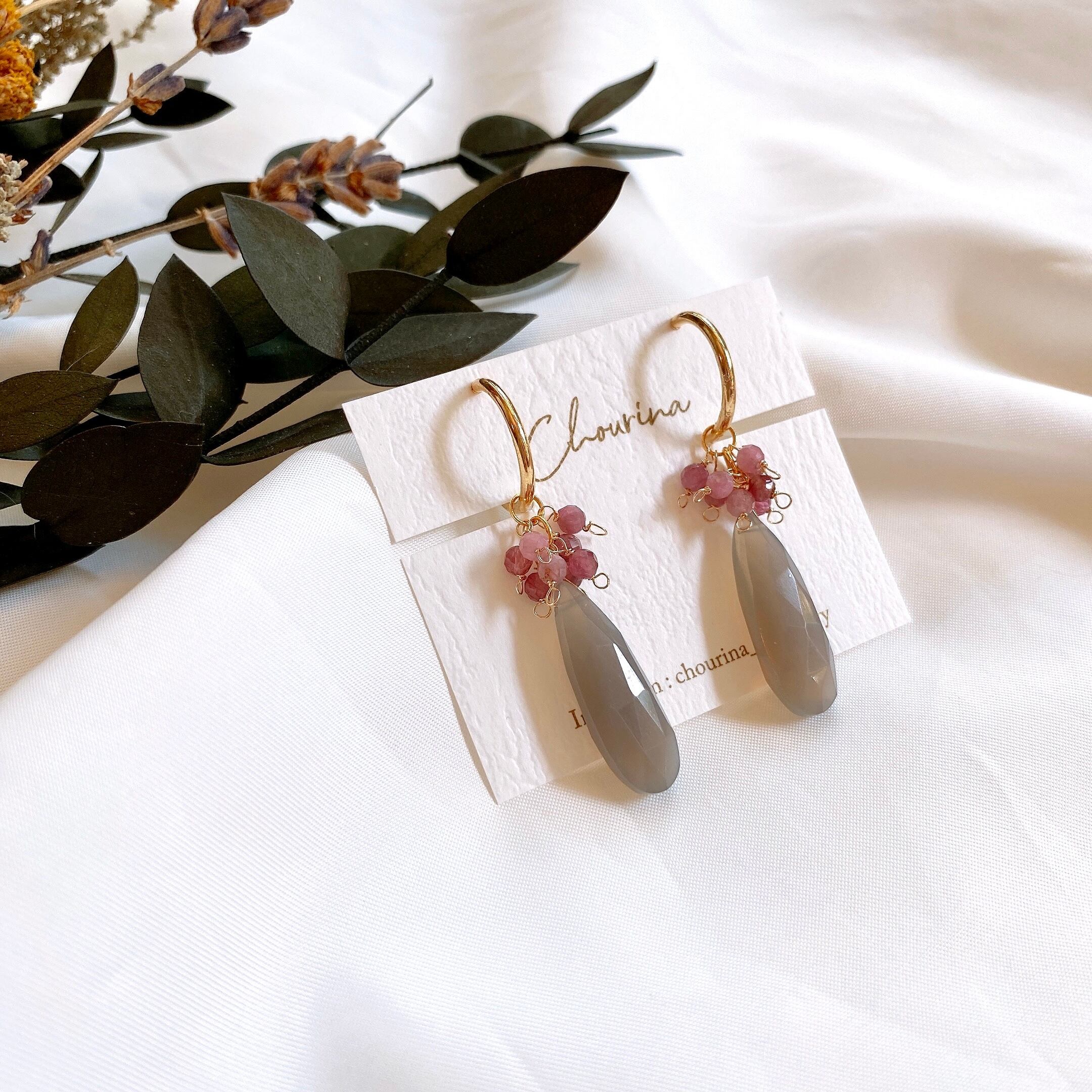淡いグレーのオニキスと小粒のピンクトルマリンを合わせたフープタイプの耳飾りです。