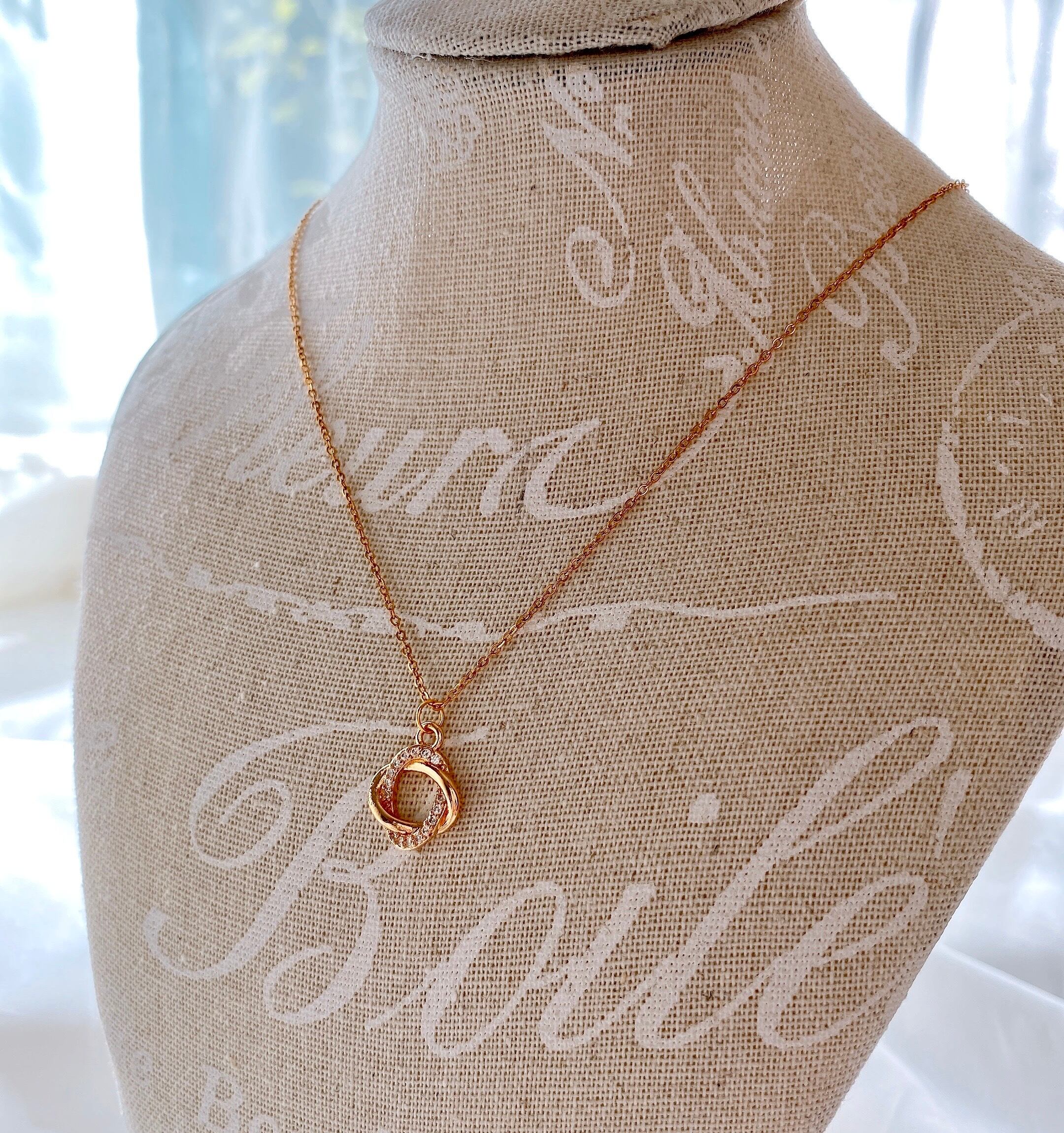 リングが重なりなったようなチャームをシンプルなネックレスにお仕立てしました。