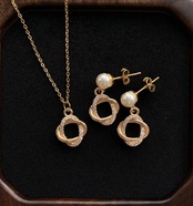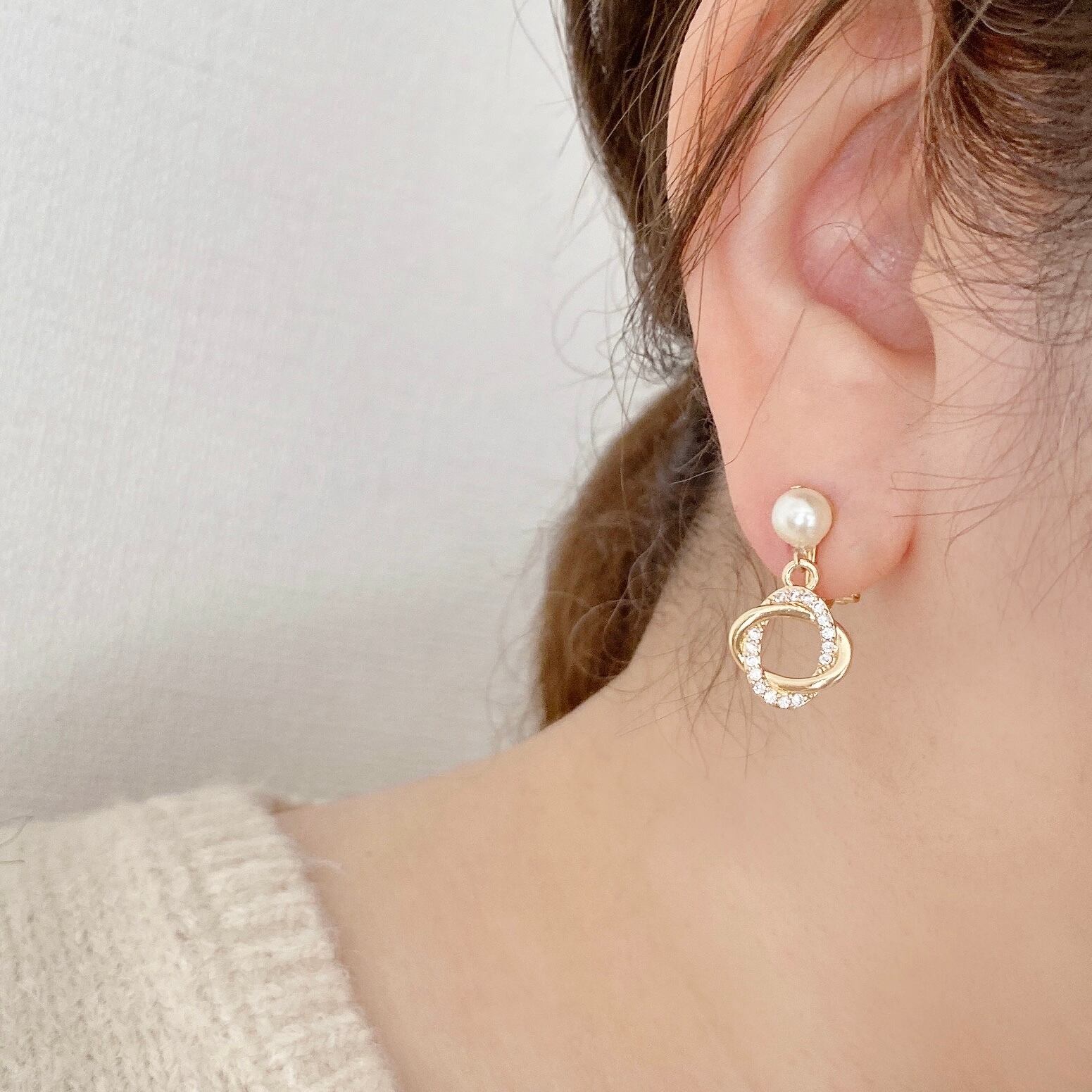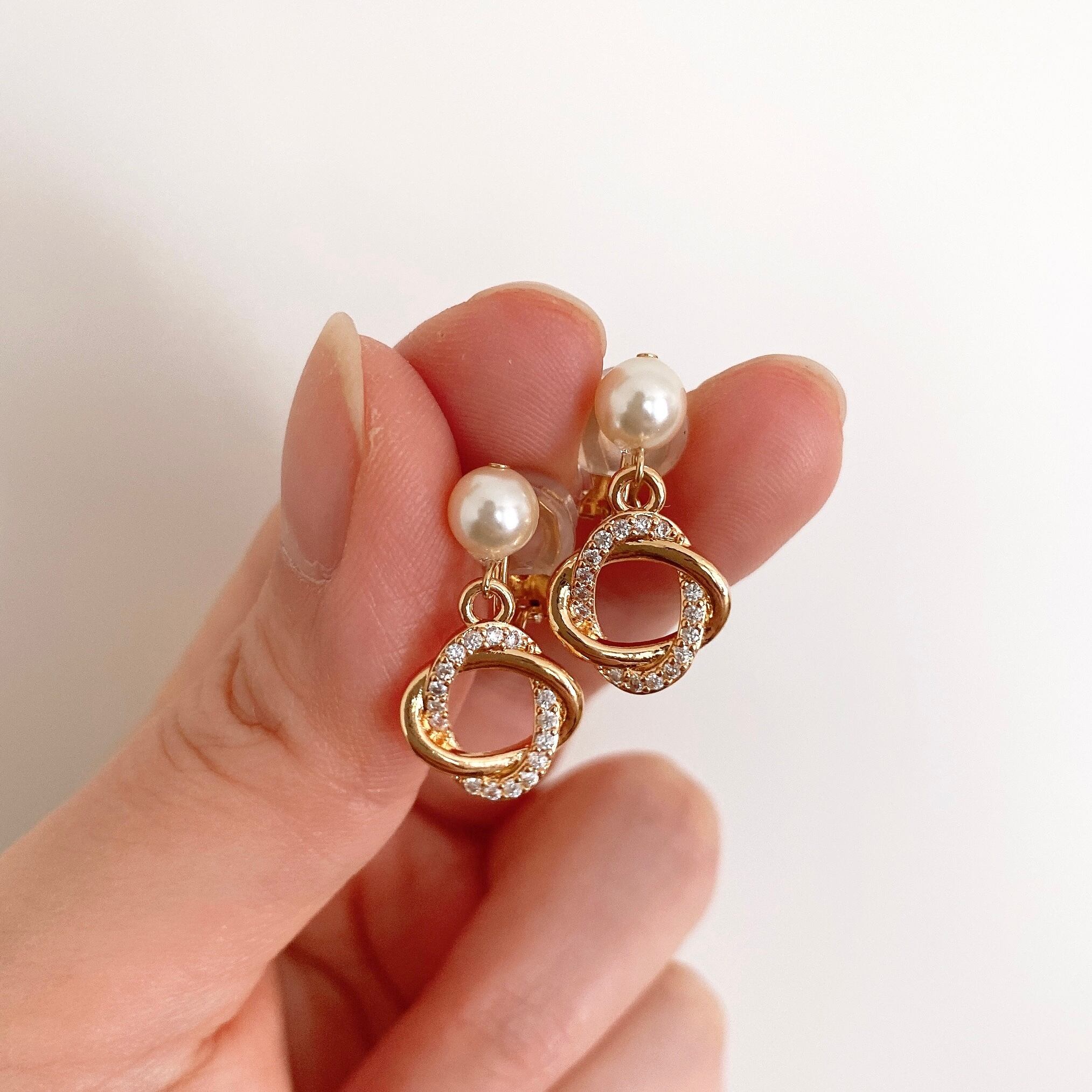 リングが重なりなったようなチャームとパールを合わせた上品な耳飾りです。