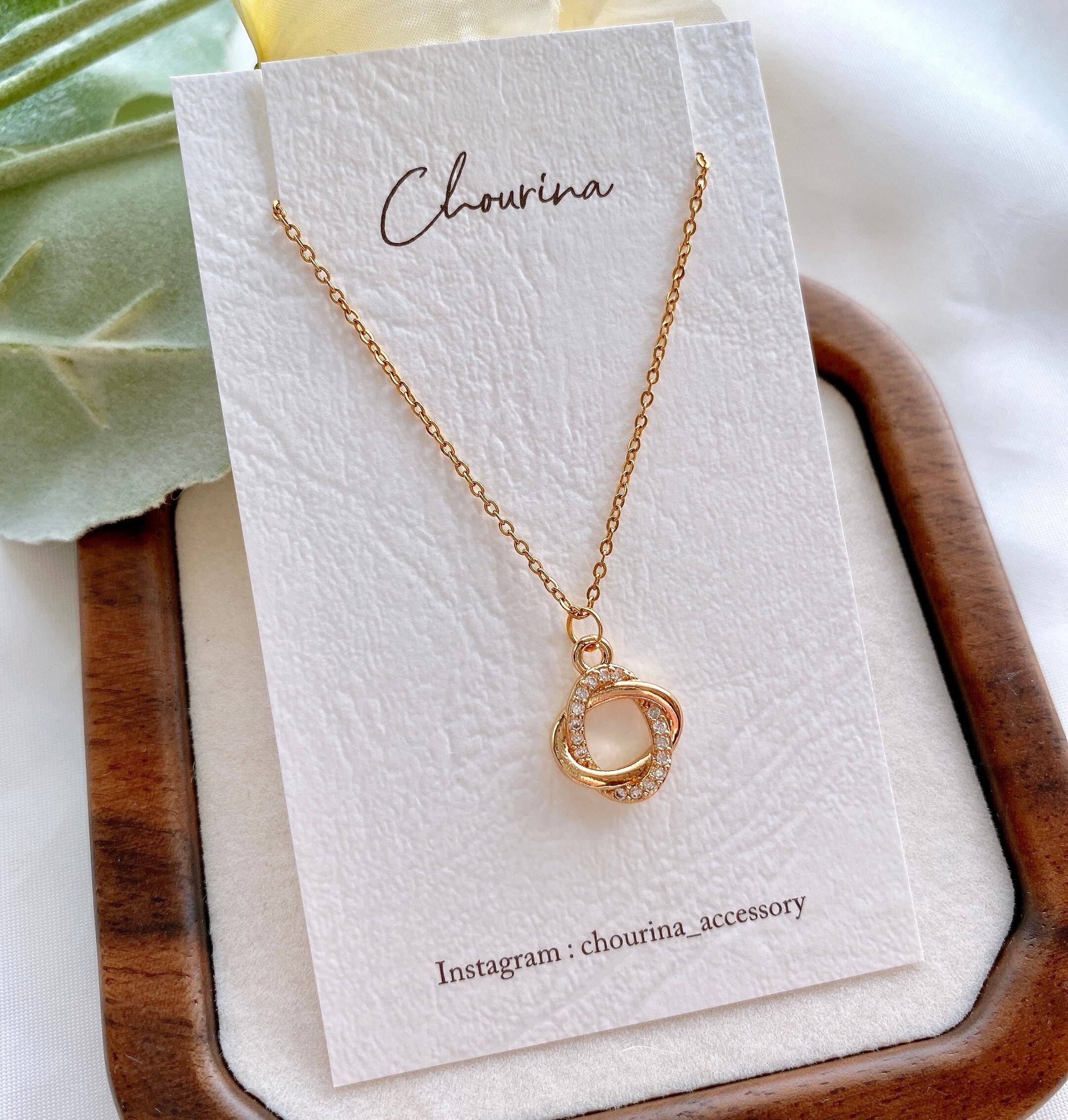 リングが重なりなったようなチャームをシンプルなネックレスにお仕立てしました。